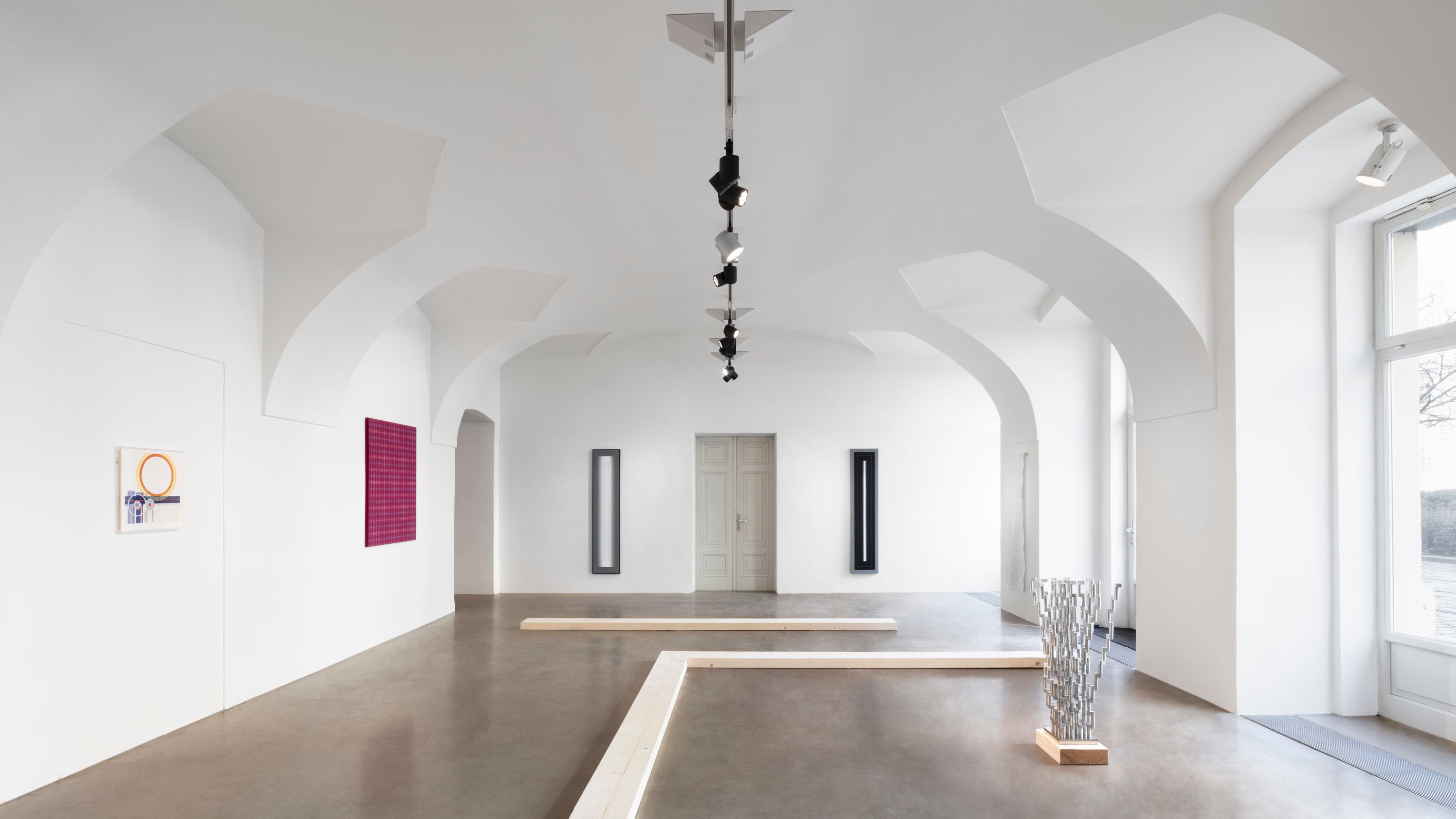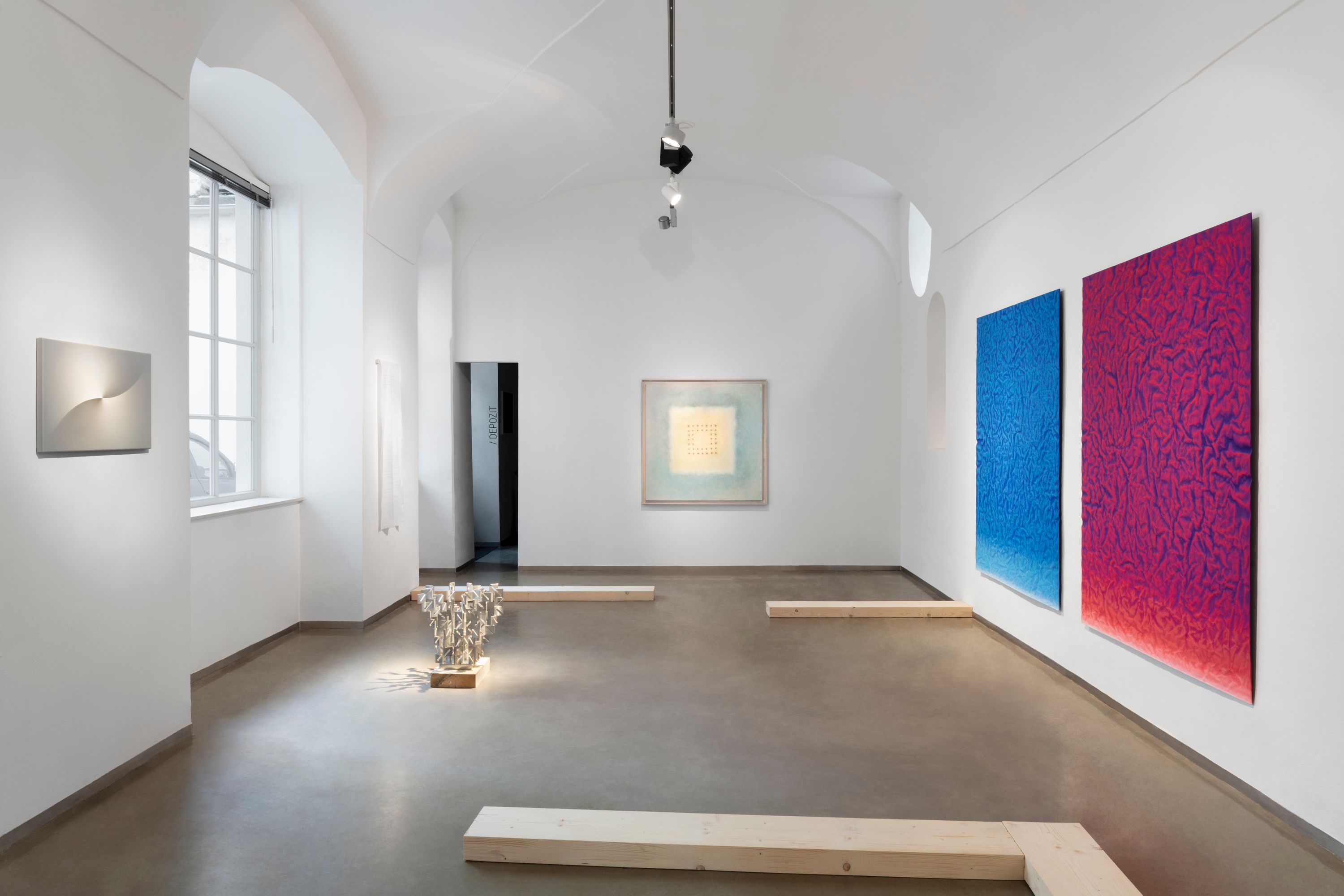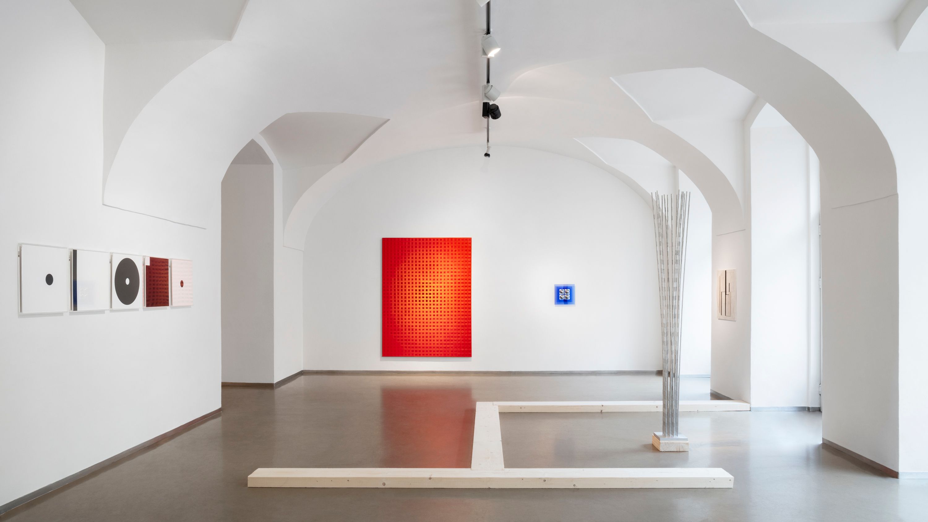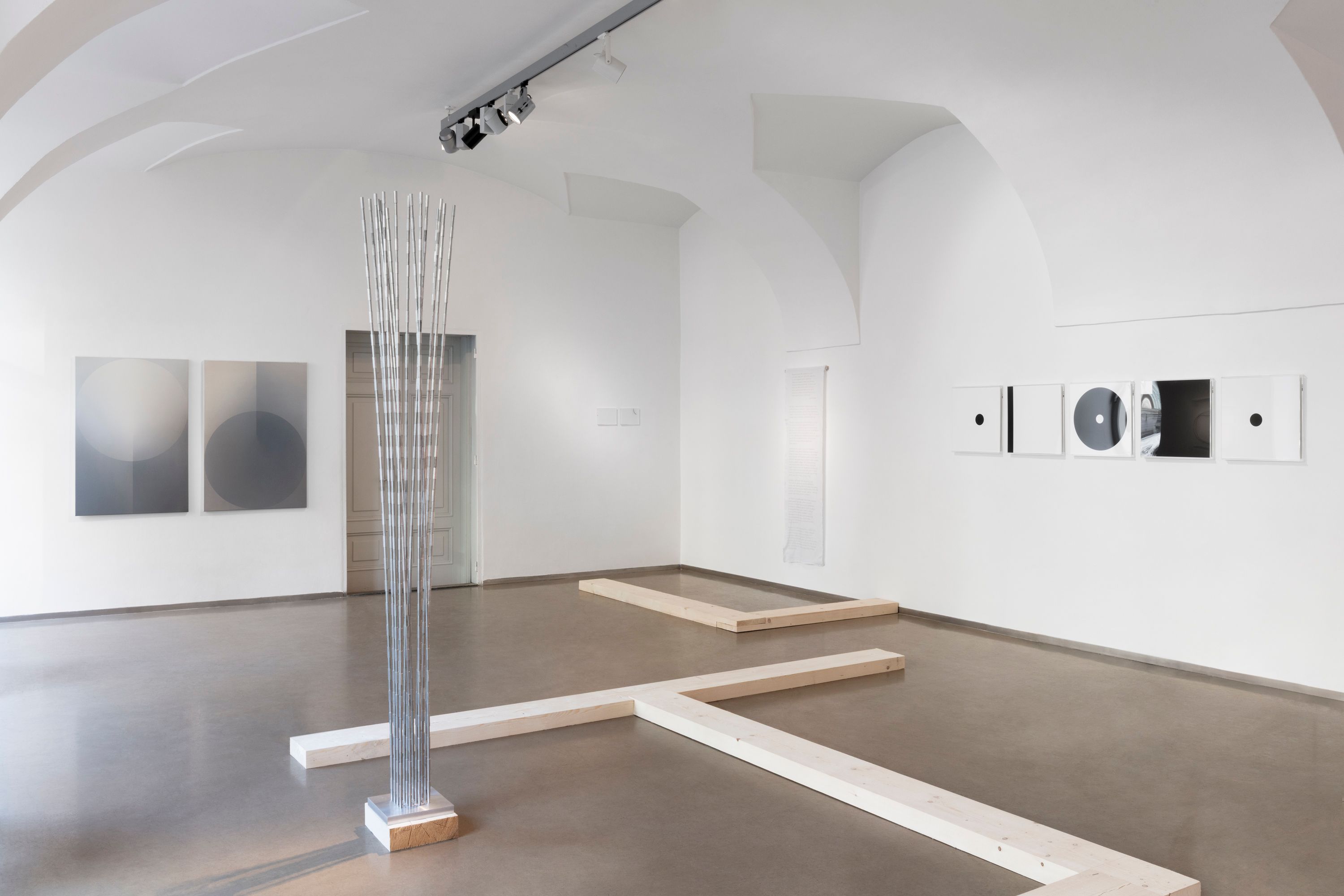 Kulturou, která má k redukci, duchovnímu přesahu a ubírání hmoty velmi blízko, je zen buddhismus. Minimalistické chrámy s akcentem na význam prázdného místa a koncentraci na meditativní vjemy jsou prostorem abstrakce par excellence. Na tento mentální obsah poukazuje architektura výstavy, která evokuje spoje podlahových trámů uvnitř zenového chrámu. Divák se může vydat trajektorií, která jej navádí k jednotlivým dílům. Pokud se však rozhodne pro vlastní cestu, má kdykoli možnost toto prostorové určení překročit.