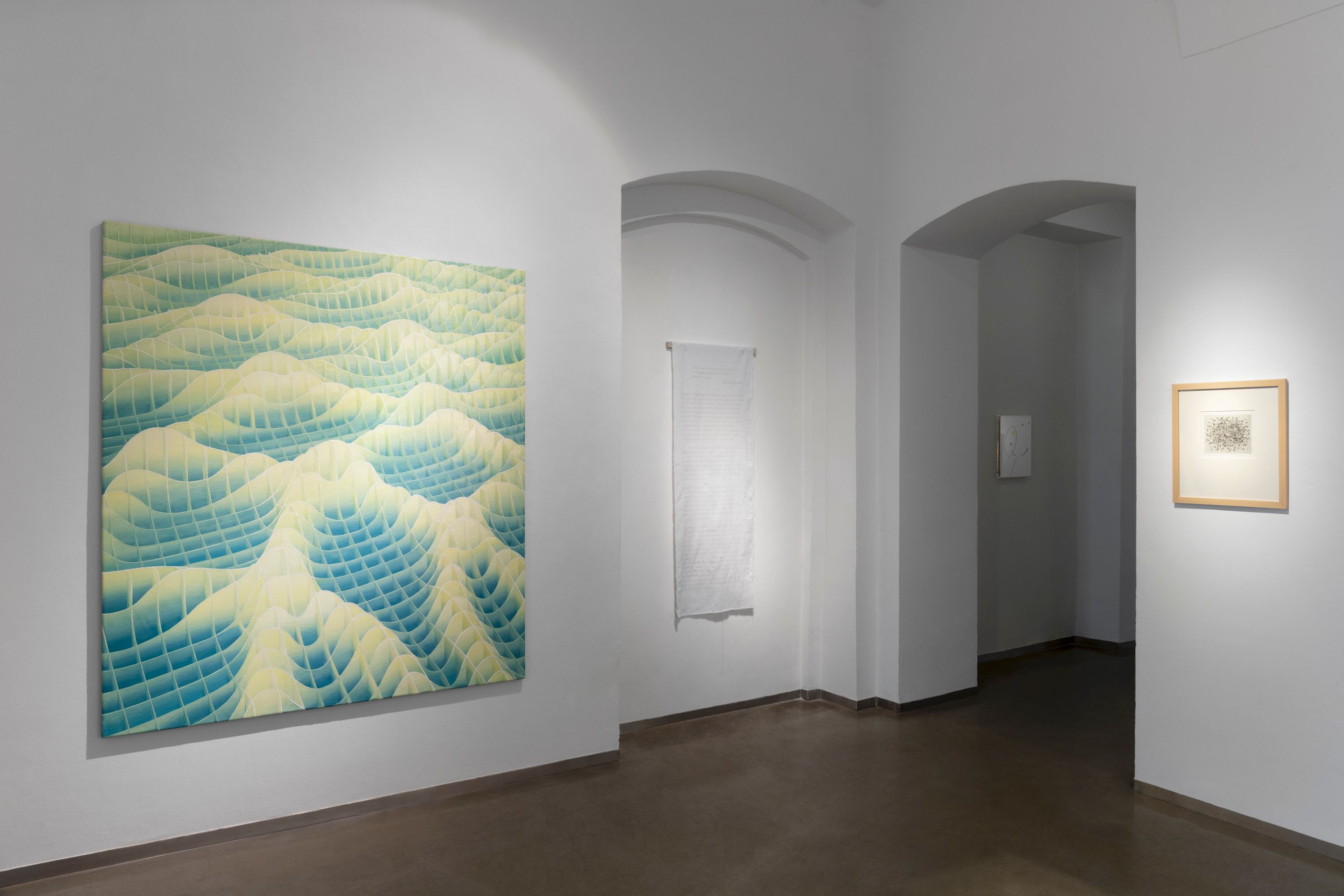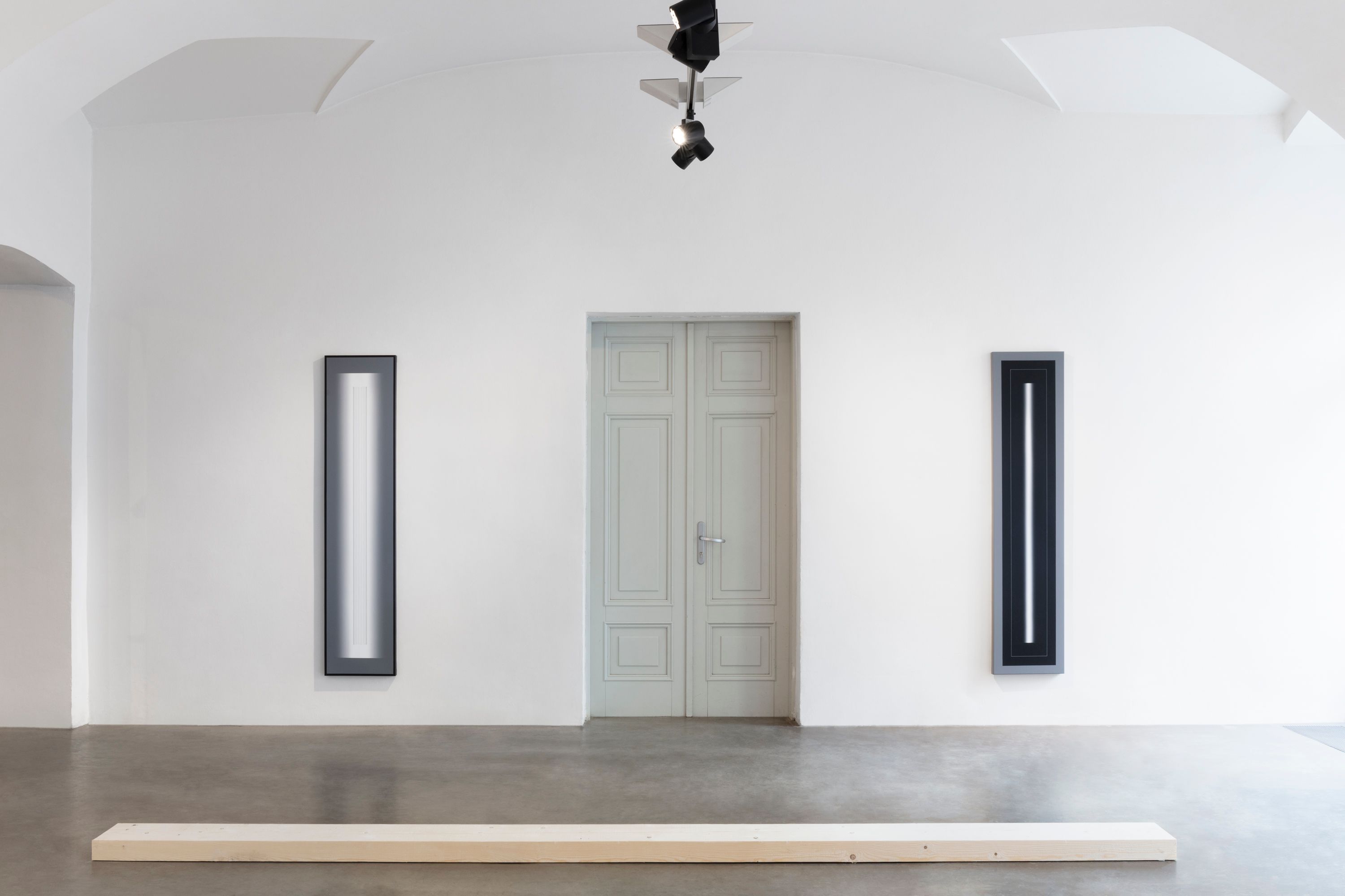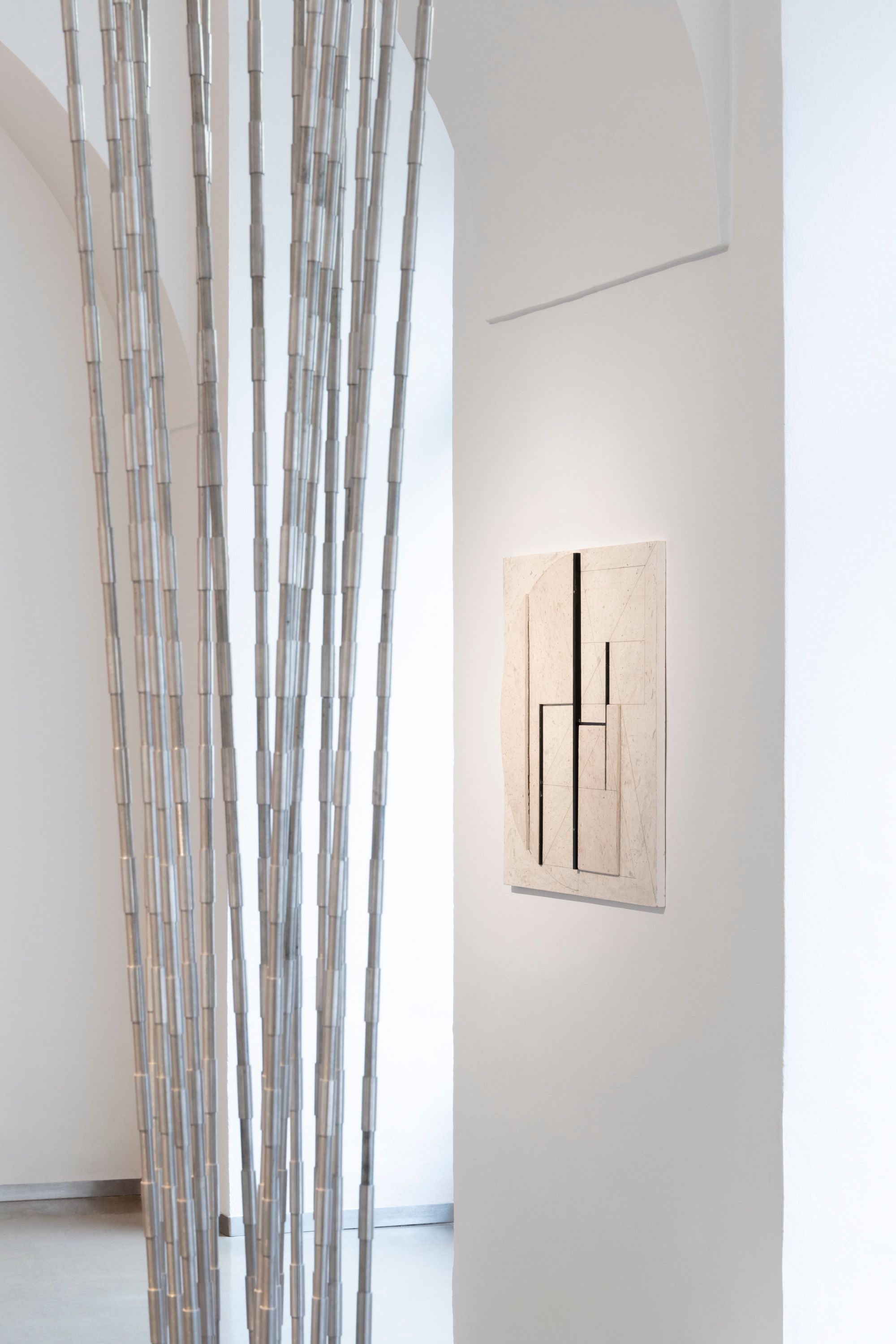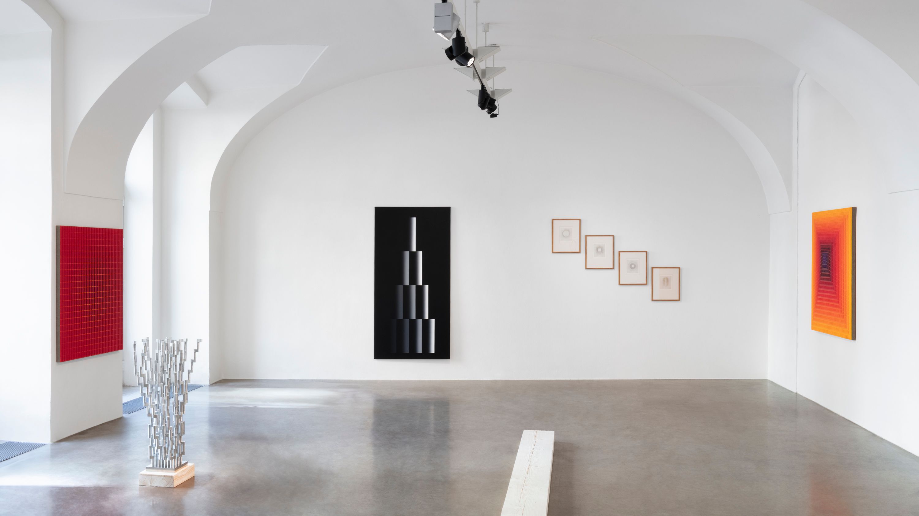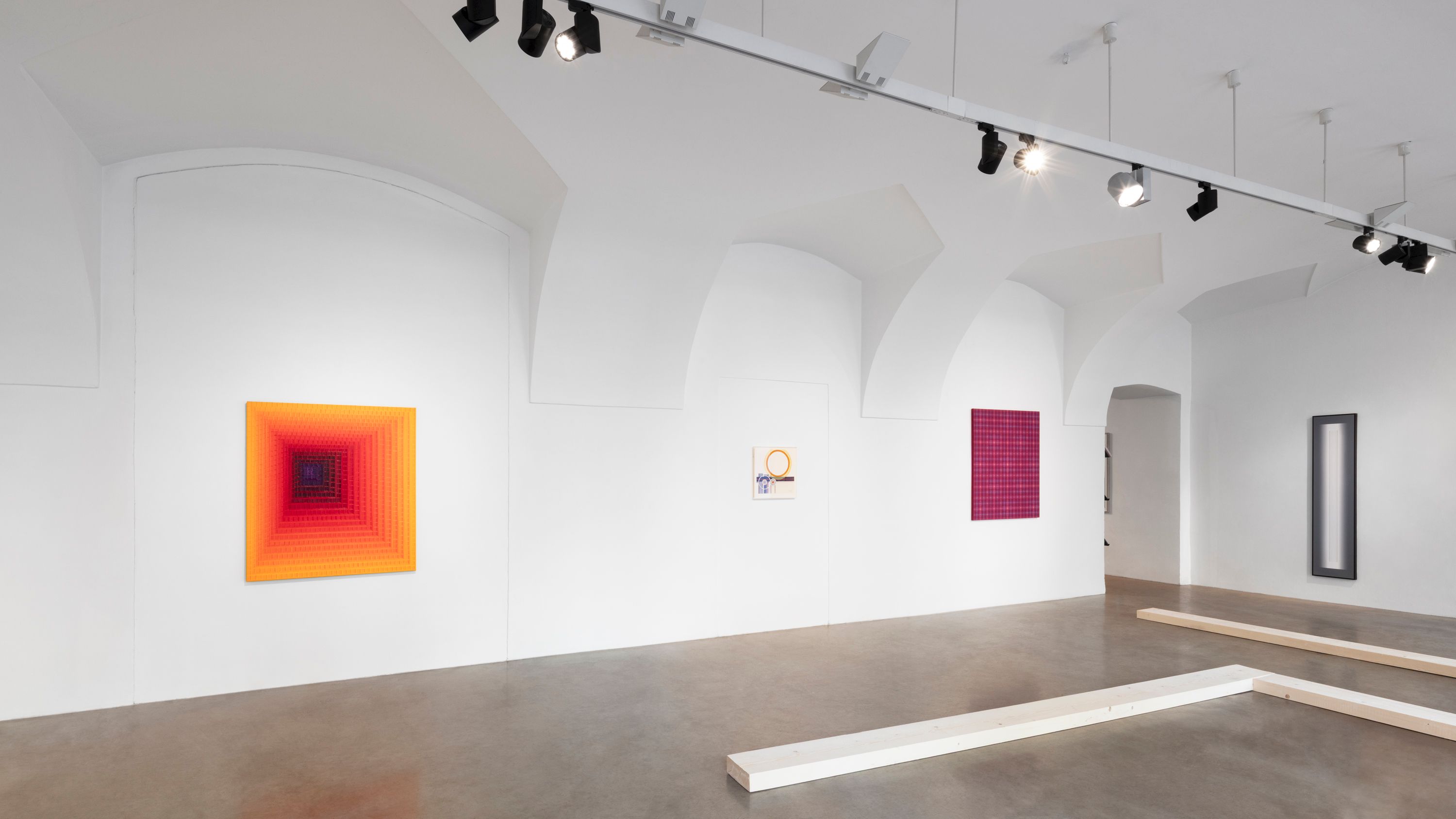 Kulturou, která má k redukci, duchovnímu přesahu a ubírání hmoty velmi blízko, je zen buddhismus. Minimalistické chrámy s akcentem na význam prázdného místa a koncentraci na meditativní vjemy jsou prostorem abstrakce par excellence. Na tento mentální obsah poukazuje architektura výstavy, která evokuje spoje podlahových trámů uvnitř zenového chrámu. Divák se může vydat trajektorií, která jej navádí k jednotlivým dílům. Pokud se však rozhodne pro vlastní cestu, má kdykoli možnost toto prostorové určení překročit.