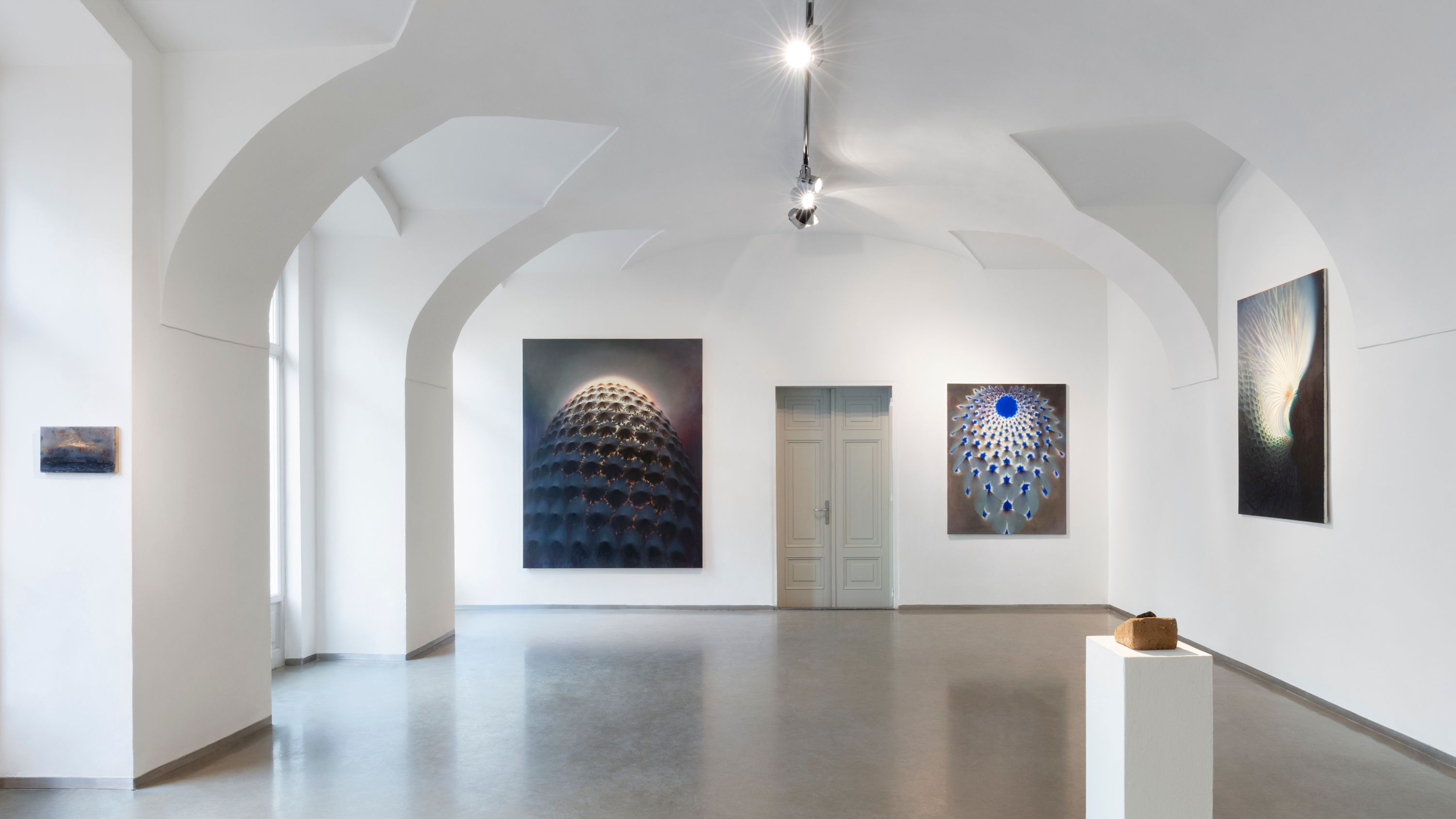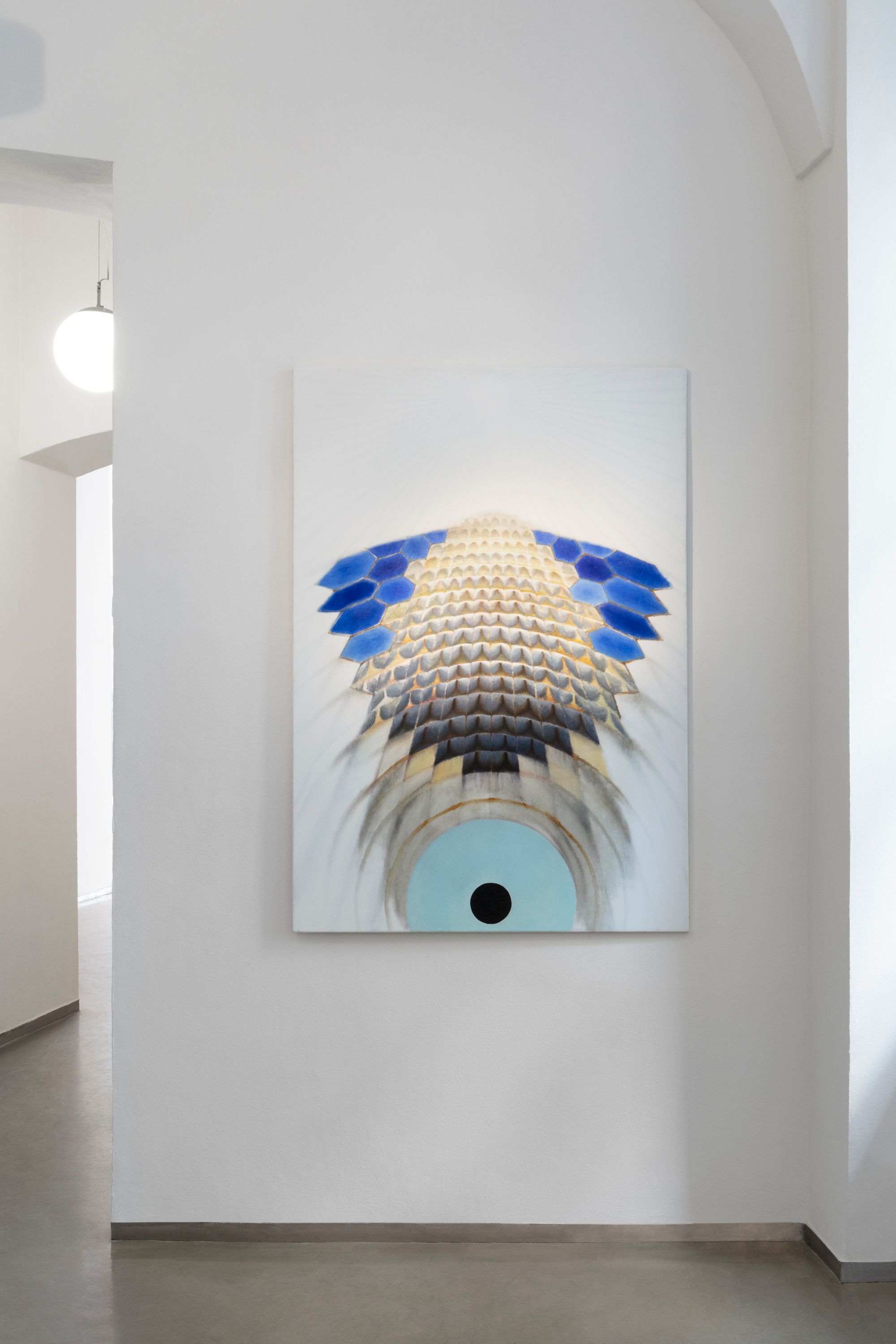 The work of Jan Uldrych approaches this theme in an emblematic yet fundamentally different way. The genealogy of his paintings rests on the foundations of natural experience, often defined by an understanding of sacred geometry, mysticism and psychedelic patterns found across flora, fauna and the layers of human consciousness. For Uldrych too, the notion of consciousness is essential, but in a more universal and open sense than in Kašpar’s interpretation. We encounter a breathtaking large format painting offering a view into the primordial ocean. These primal waters are represented by a geometric pattern stretching into infinity, beyond the horizon of the unconscious — oriented toward the sacred dimension of knowledge, toward the first star, toward the mystery of the original light. The only thing that disrupts this perfect pattern of archetypal waters is the twist of a gigantic reptile animating the regular waves of consciousness. Here again, an original stability is disturbed.