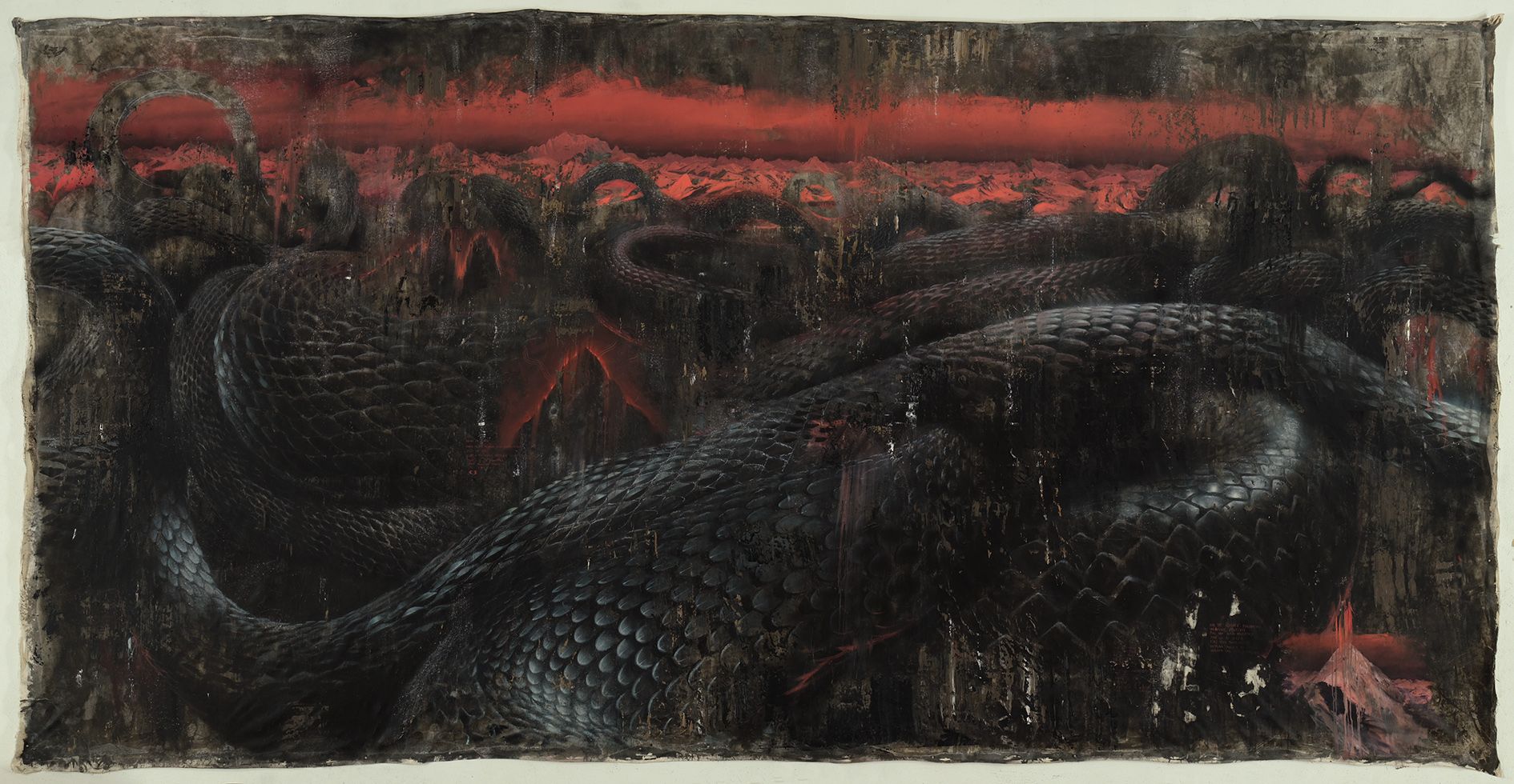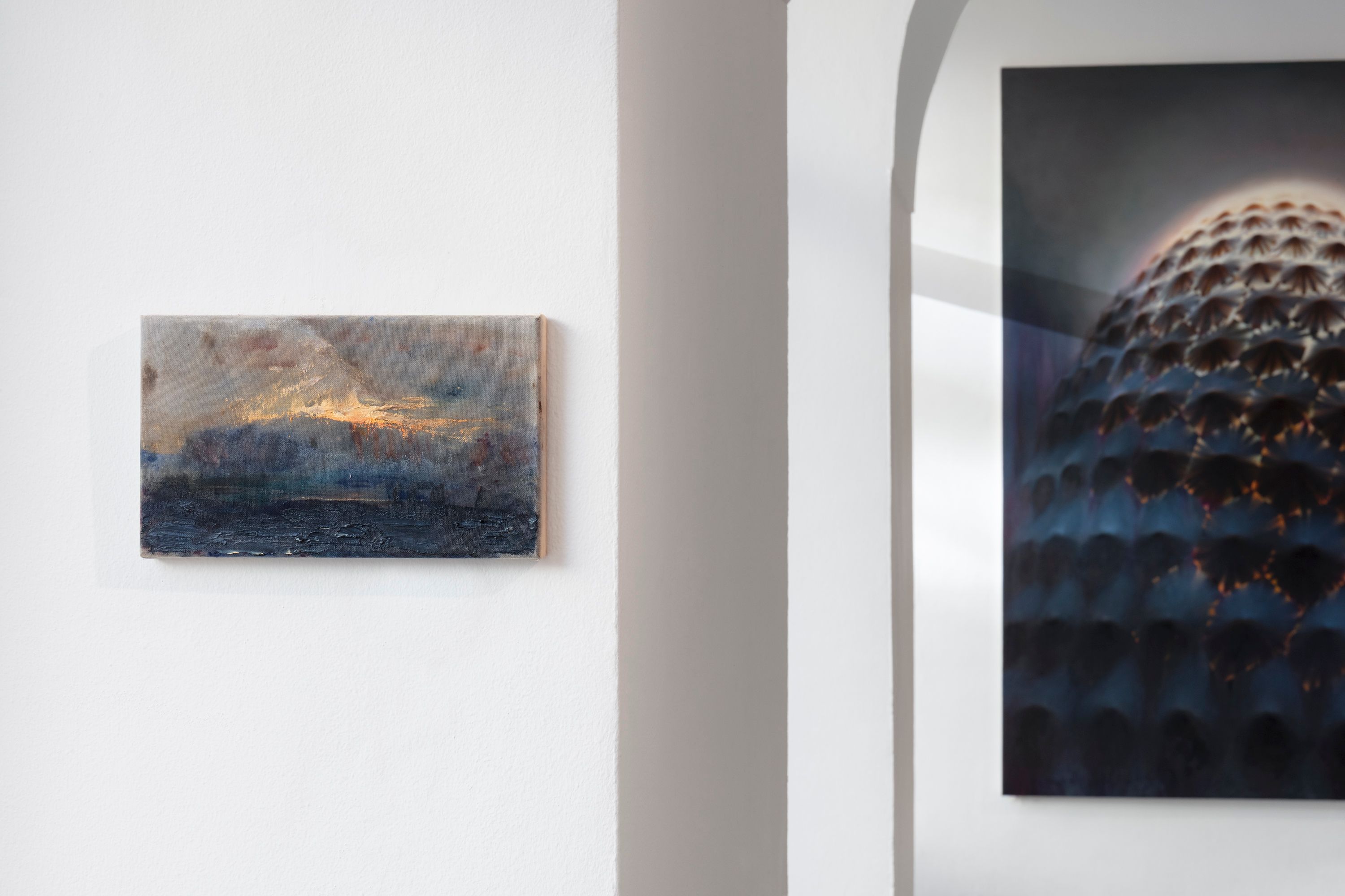 It is difficult to begin anywhere other than with the original and more potent principle, the feminine. Adam Kašpar became fully absorbed in it already in the exhibition Urpflanze (the “primal plant”), whose seed continues to nourish his current work. In the Sumerian myth, the role of this primal plant is assumed by Inanna (later Ishtar), whom the king waters like a date palm during the ritual of the sacred marriage. She is a contradictory figure: goddess of war and sexuality, yet also Promethean in character as she brings culture to humanity against the will of the elder gods. This aspect intensifies as she confronts the mountain dragon, embodying an even older facet of femininity, the primordial ocean, the instinctive world, the Mother who existed before the world and who, with the emergence of humanity and consciousness, must now die. Kašpar undertakes the genesis of a monumental canvas depicting this mythic dragon, representing both the underworld and paradise in one, where death mirrors birth, where scales metamorphose into mountains, where the dragon becomes the mountain itself — not a geological formation, but an archetypal one. Opposite this terrifying creativity stands Inanna with her spear, prepared to kill the beast. Dragonslaying here becomes a symbolic expression of the birth of consciousness: the instinctive certainty of the maternal world dies, making way for self-awareness. Yet the dragon does not die entirely — it undergoes a profound transformation, the whole process resembling what Michel Tournier describes as the “great inversion,” a turning inside out. Thus consciousness is born from the unconscious, culture from nature, light from darkness — not as something new arriving from outside, but as the reverse side of things themselves. With this, a conflict enters the world between opposing faces of divinity; a conflict whose reconciliation and underlying unity is sought by every form of hieros gamos, whether between a king and Inanna, Christ and the Church, or the albedo and nigredo of the alchemists.